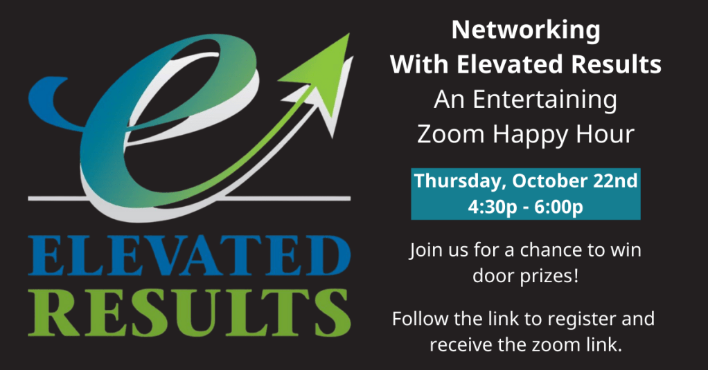 We would like to invite you to our Elevated Results Core Group Guest Happy Hour on Thursday, October 22, 2020, 4:30pm – 6:00pm via Zoom. In addition to learning more about Elevated Results and the great group already assembled, we have prepared many presentations to keep this a fun and entertaining zoom event! Our goal in hosting these events is to expand the circles of influence for our members and our guests. We will share contact info with all attendees for you to continue connecting after this event. We look forward to virtually seeing you soon!